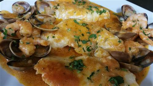 Cooked with clams and king prawns