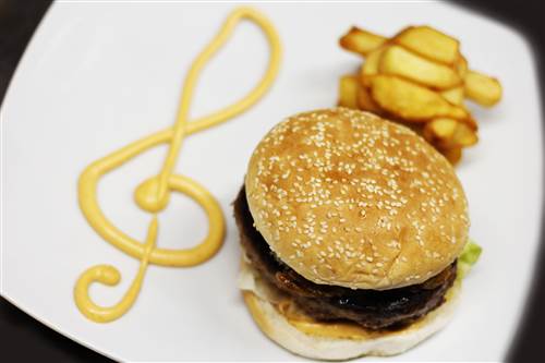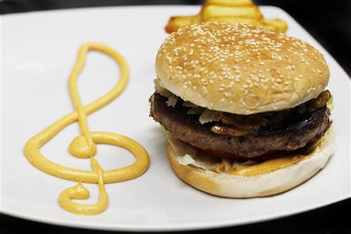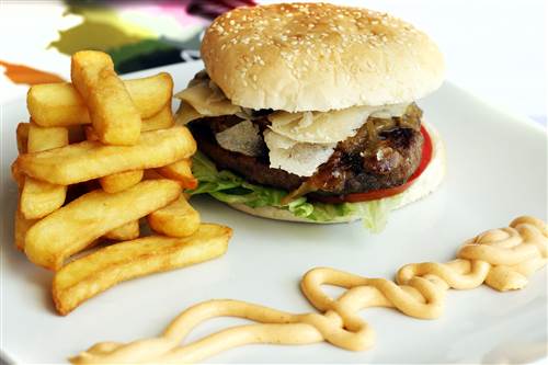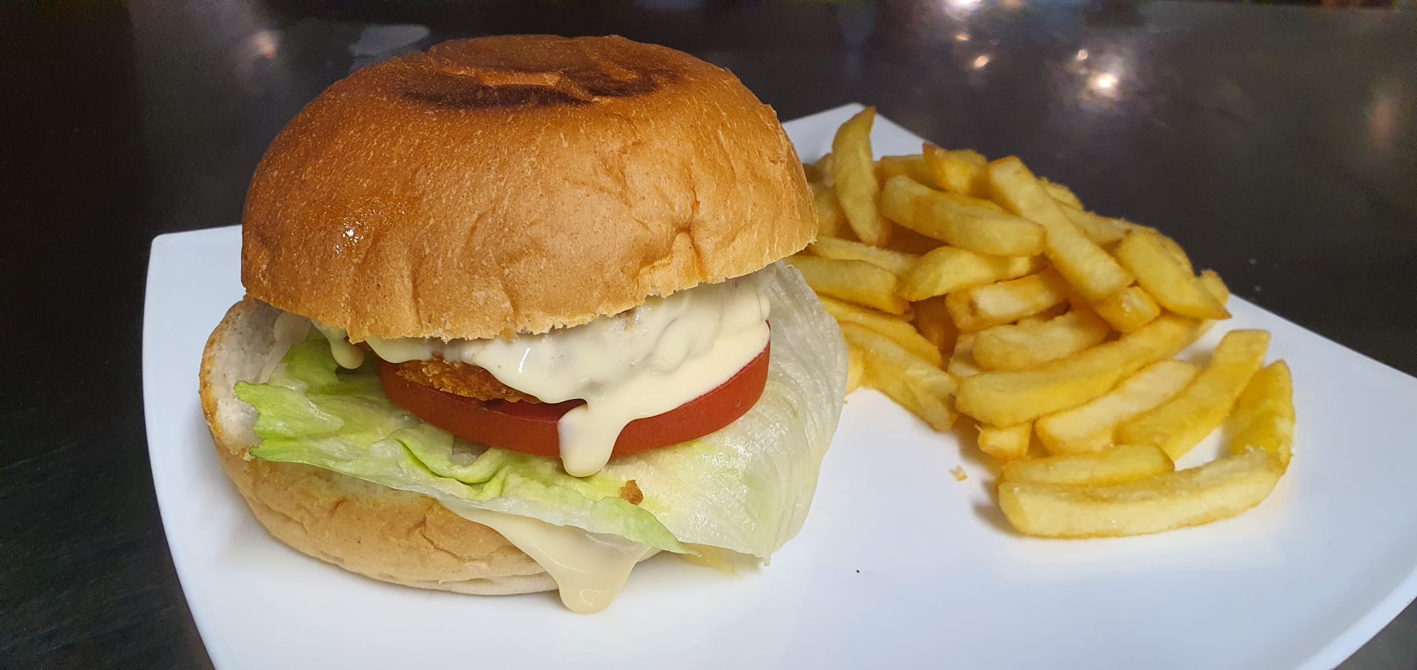 With lettuce, tomato, fried onion, gherkins, cheese and burger sauce