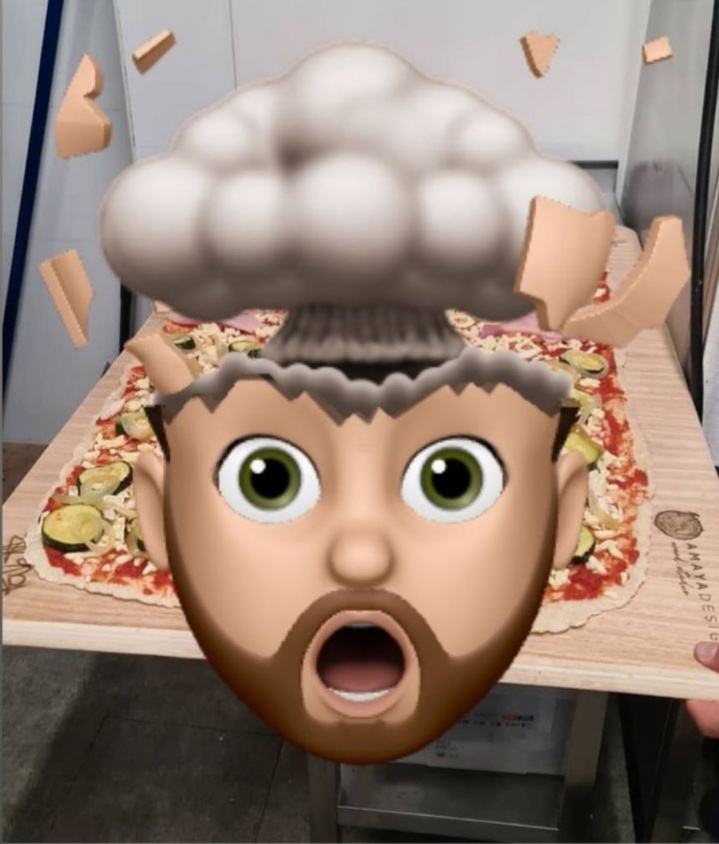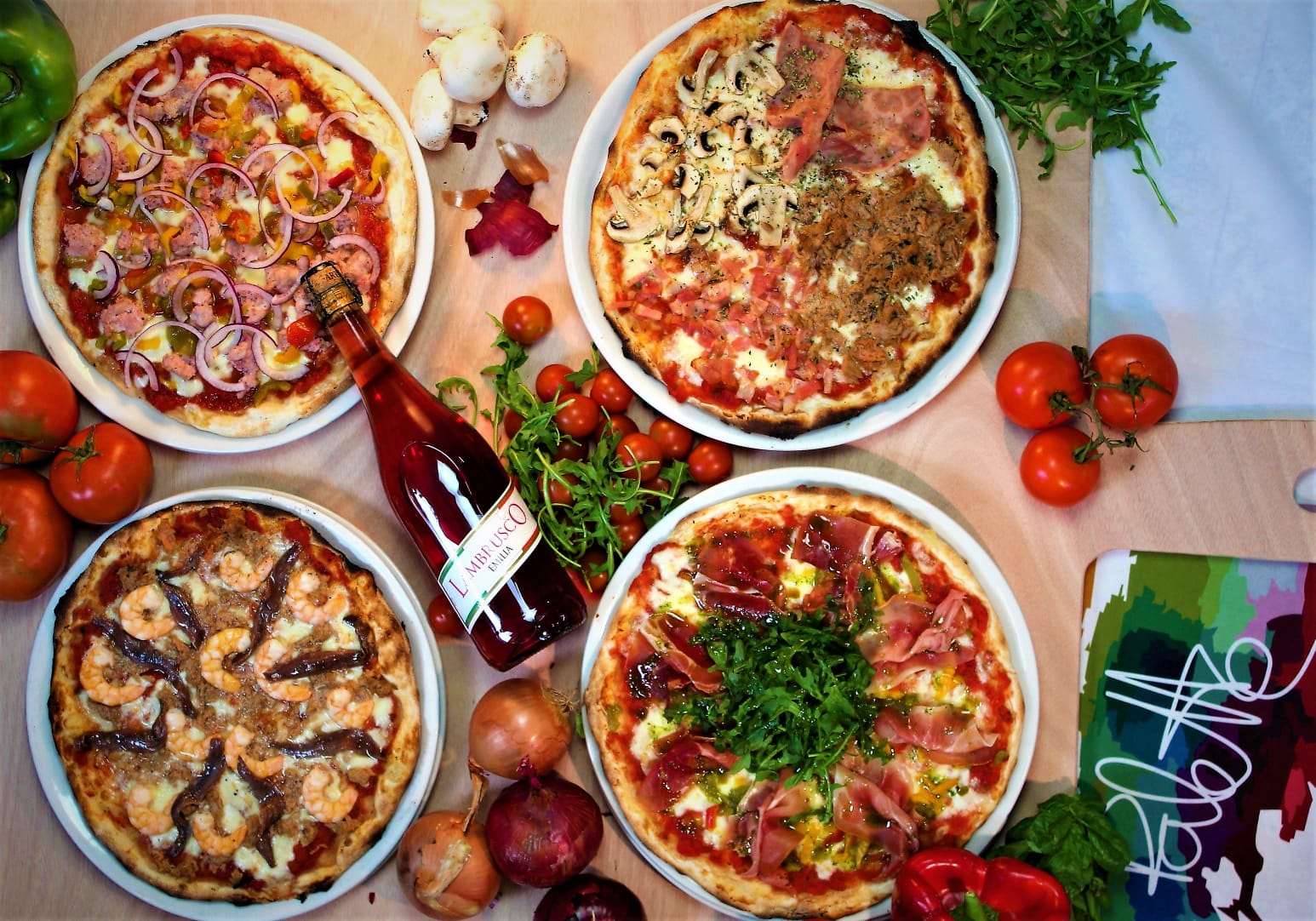 Una enorme tabla de Pizza de un metro de larga por setenta y cinco de ancha, compuesta de cuatro Pizzas entre muchas a elegir, más una botella de Lambrusco Emilia Italiano.
