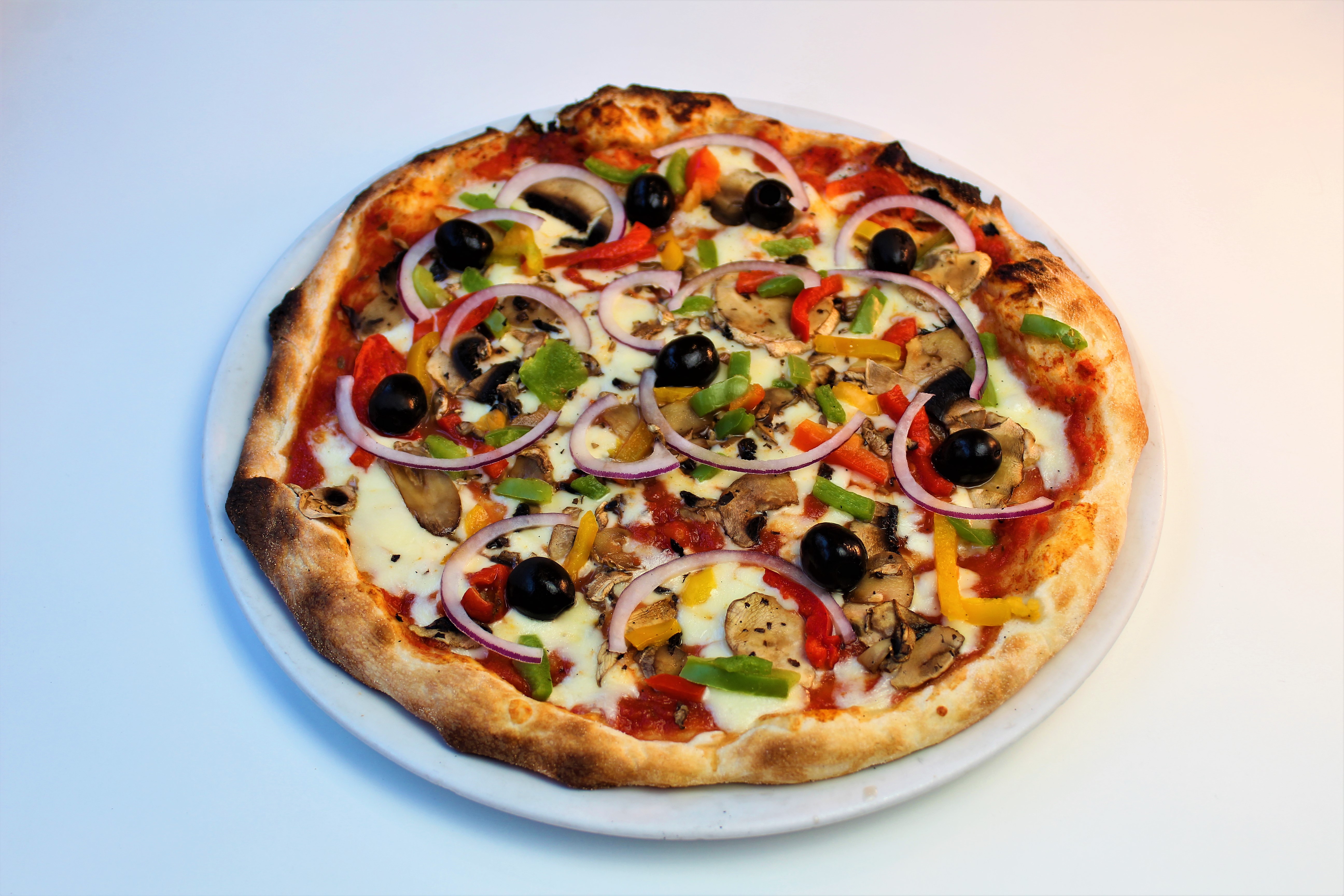 Tomate, mozzarella, pimientos tres colores, champiñón, cebolla y aceitunas