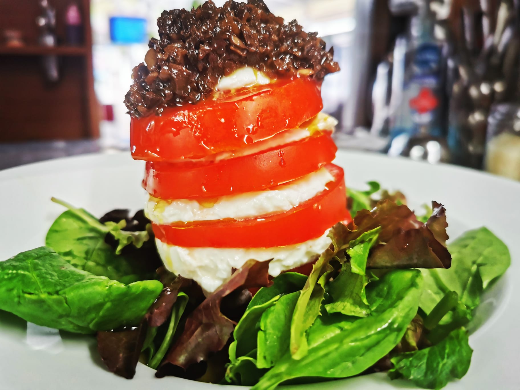 Tomate, mozzarella, cebolla, aceitunas negras y vinagre de Módena